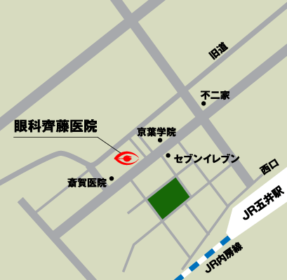 JR内房線五井駅西口下車、駅前大通り2つ目の信号を左折し(不二家の交差点)、約200メートル先右側。