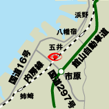 国道16号線からお越しの場合、市原臨海競技場手前「コスモ石油」の交差点を五井駅方面に入り、「五井駅入口」交差点の次の信号を右折し(不二家の交差点)、約200メートル先右側。